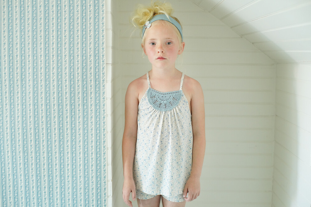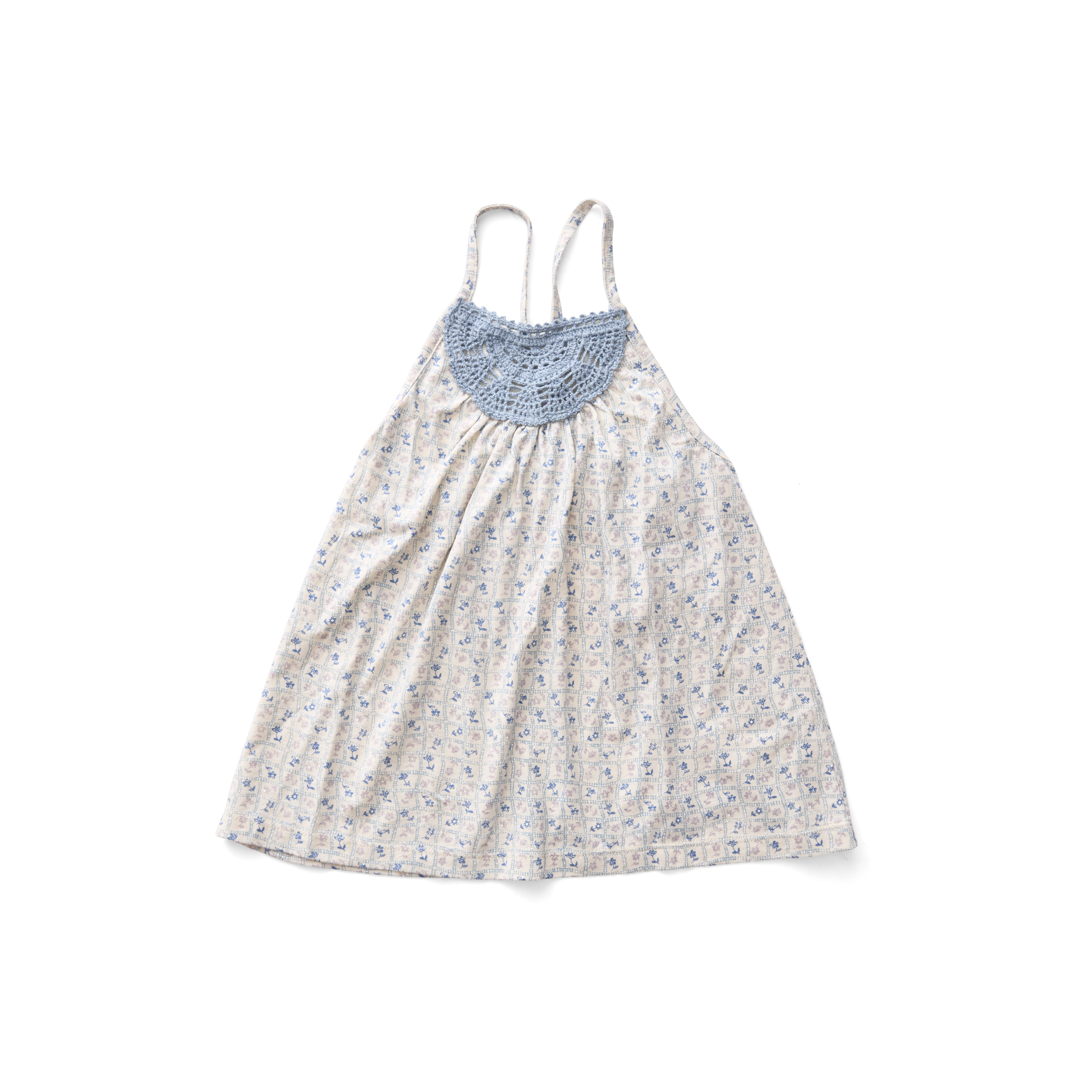Strappy camisole in organic pima cotton jersey with a hand crochet yoke.