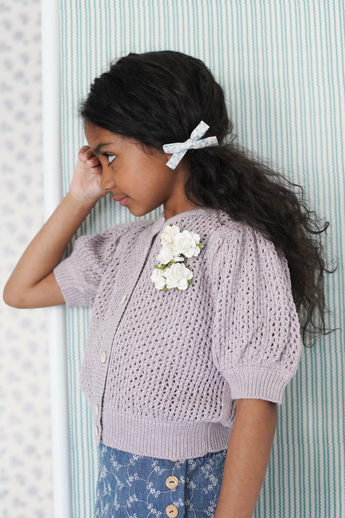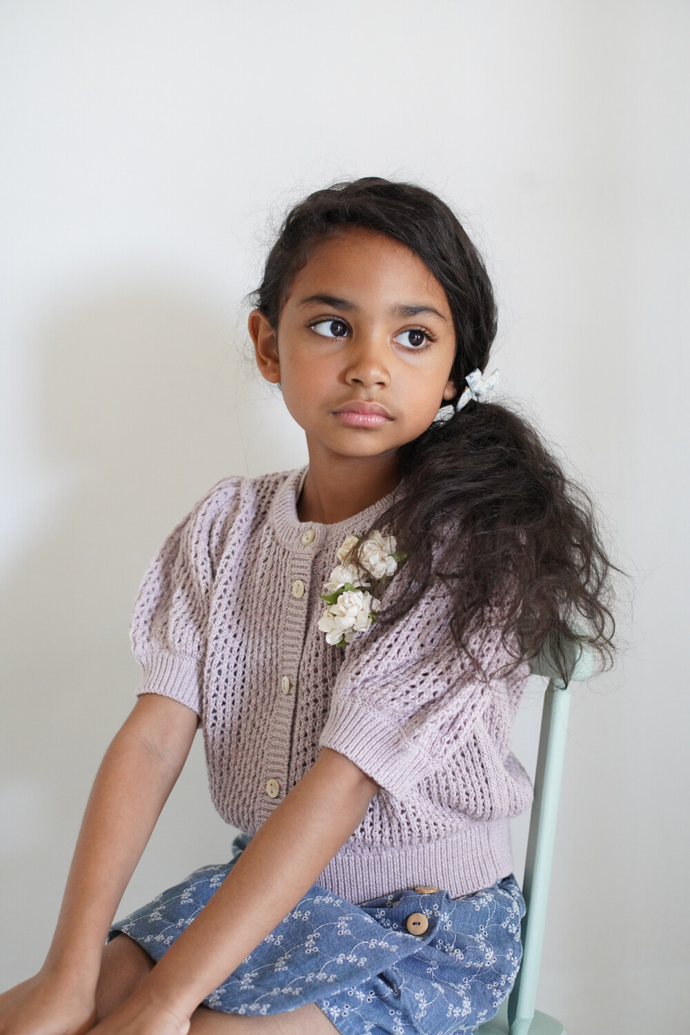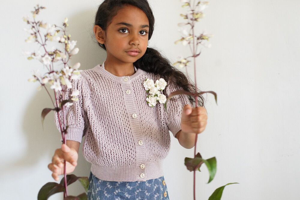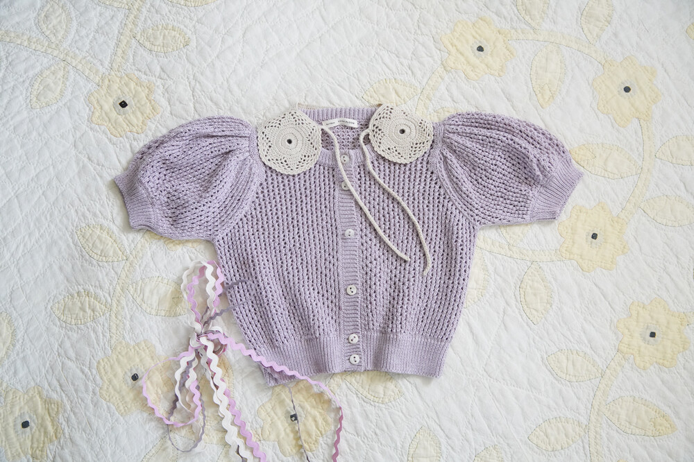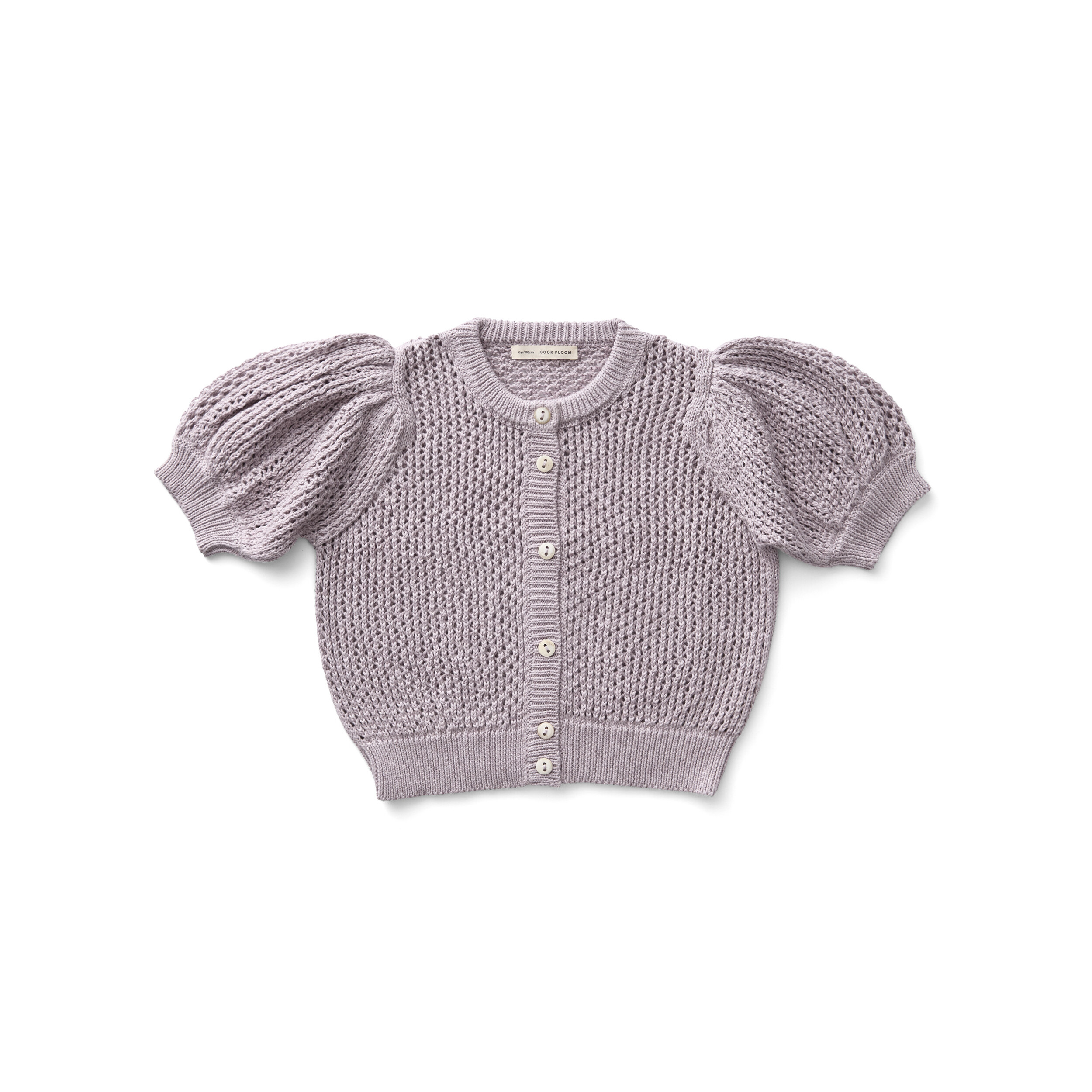 Pouf sleeve cardigan in a our chunky lace stitch.Natural horn button lined rib placket. Slight oversized look.